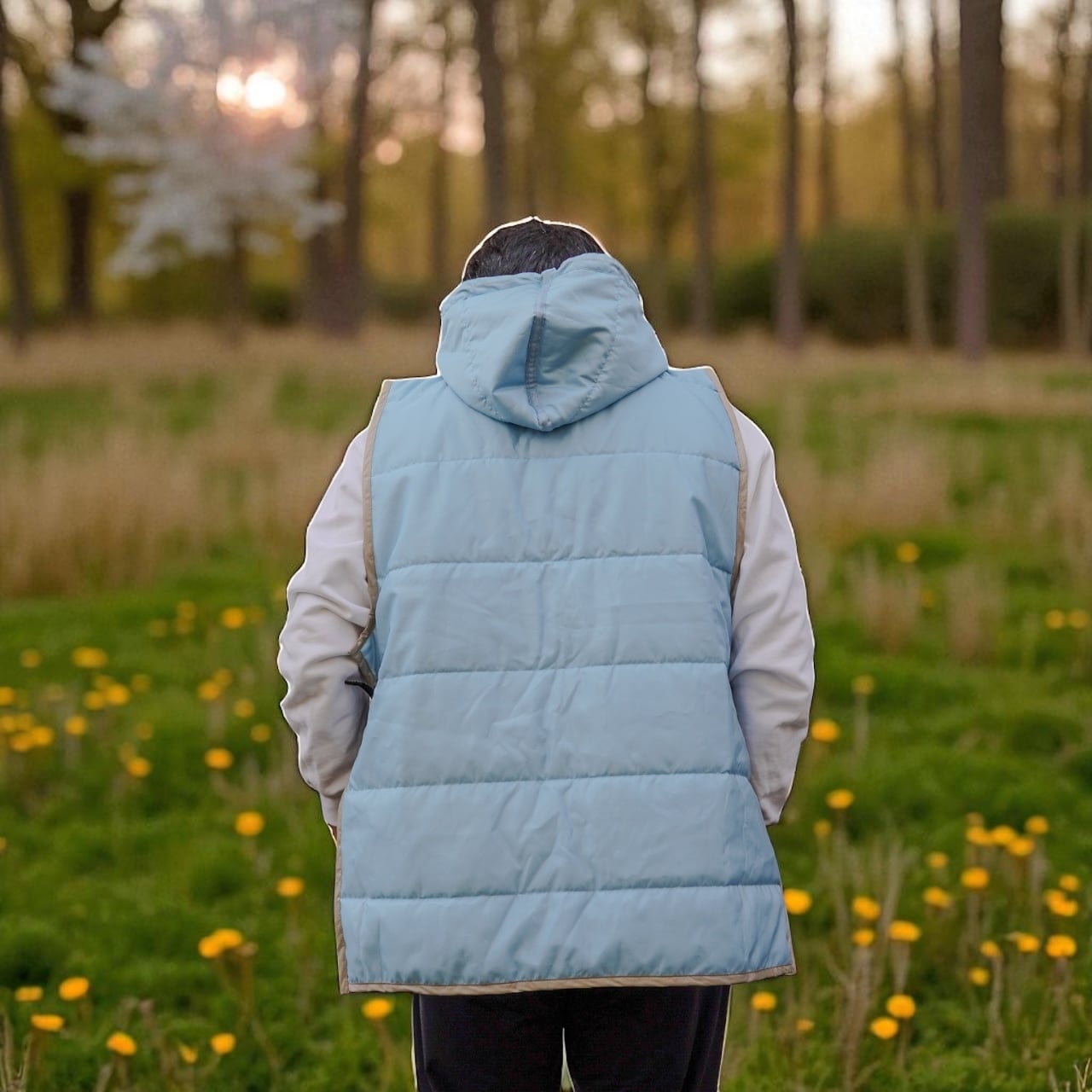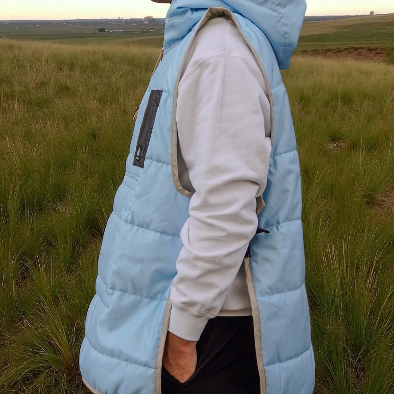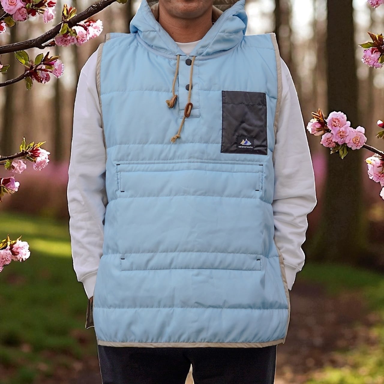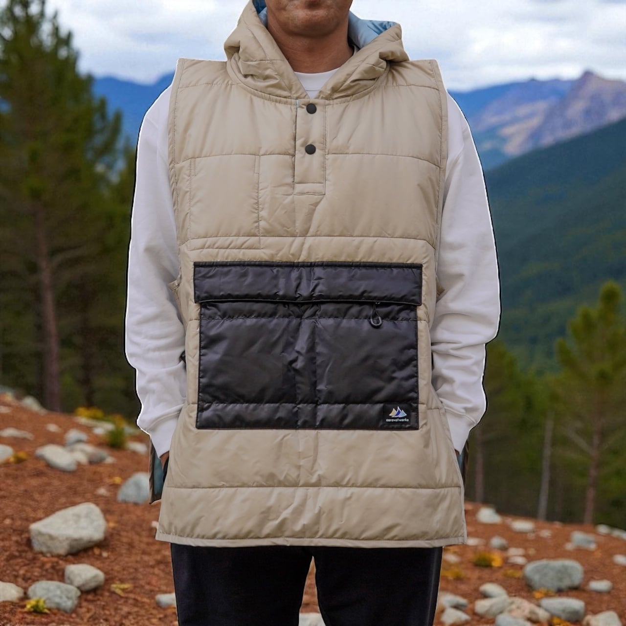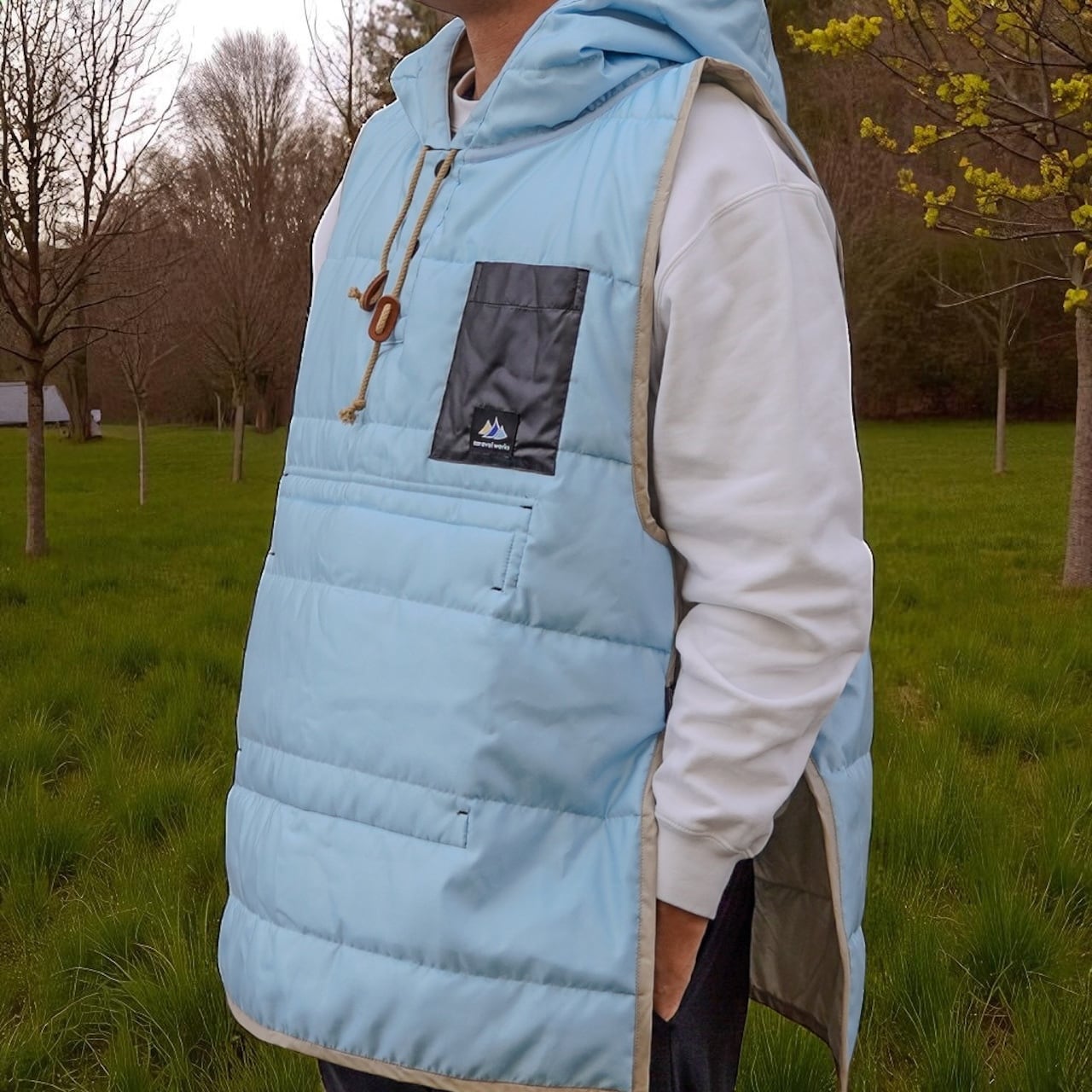 アウトドアシーンに最適なキャンパーズベストが登場!軽やかで快適な着心地が特徴で、シャンパンゴールドとライトブルーのリバーシブルデザインによって、自然の美しさにマッチする華やかなスタイルを演出します。