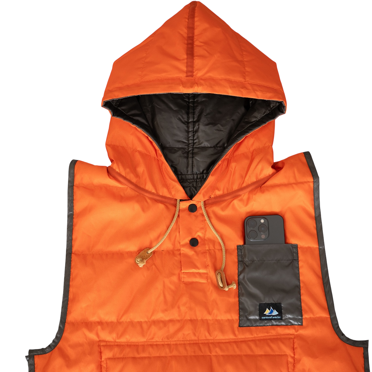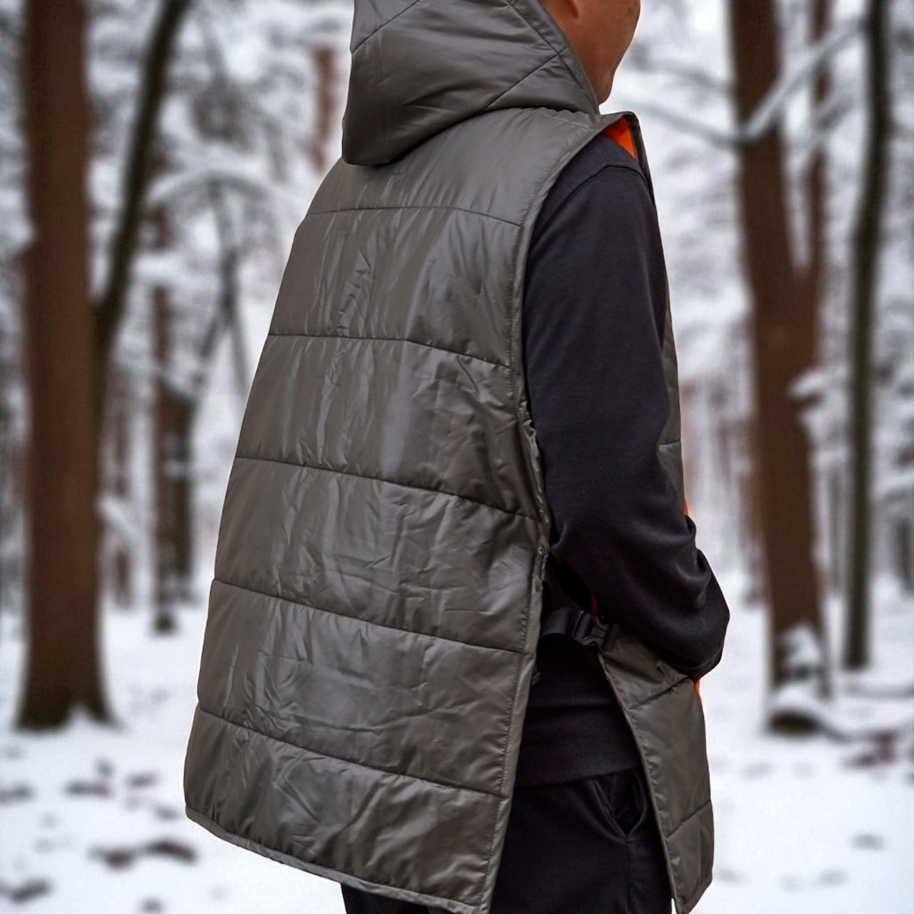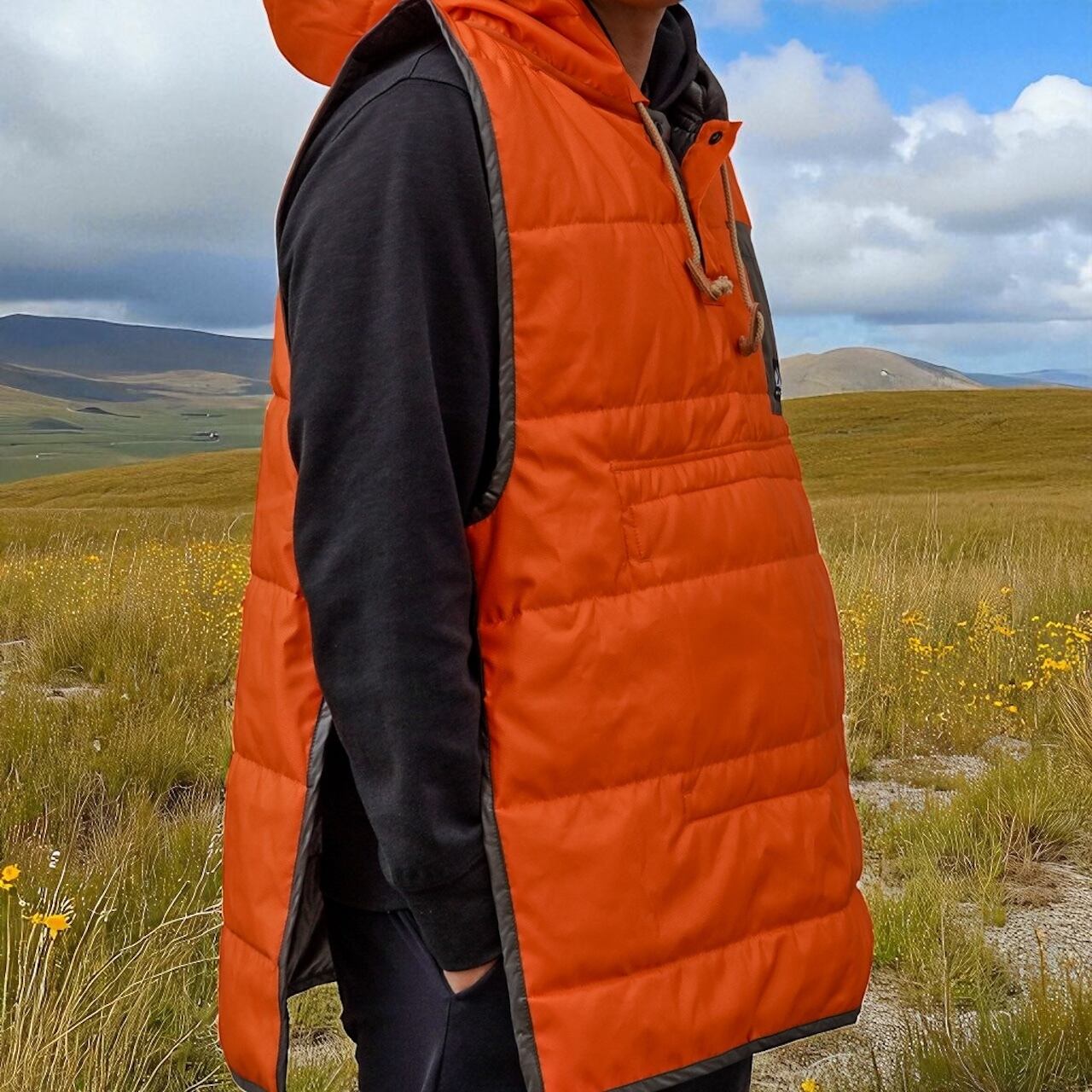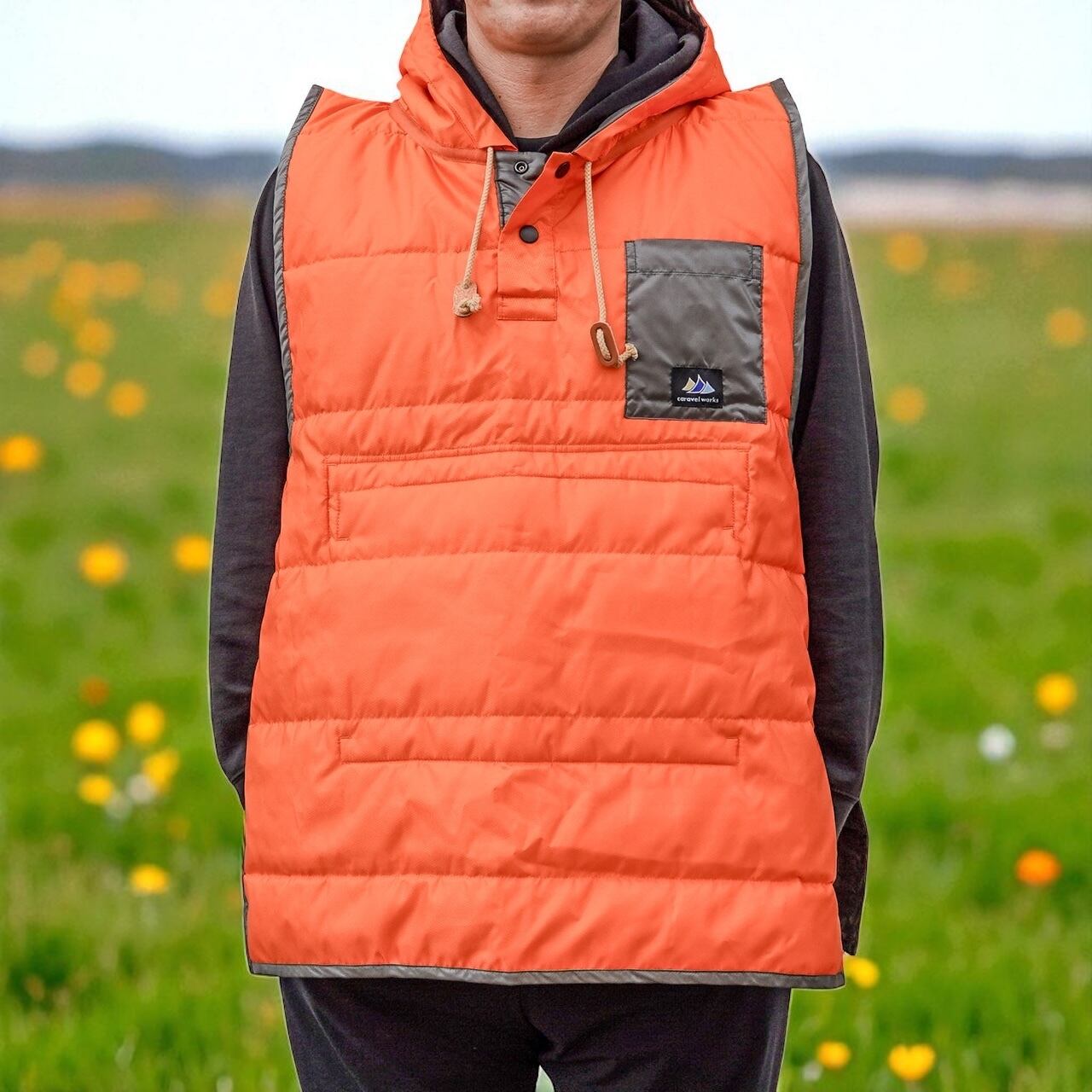 キャンパーズベストが新登場!キャンプやアウトドア活動に最適なシンプルでスタイリッシュなデザインは、チャコールとオレンジの個性的な組み合わせで、自然の中でも一際目を引くアイテムです。