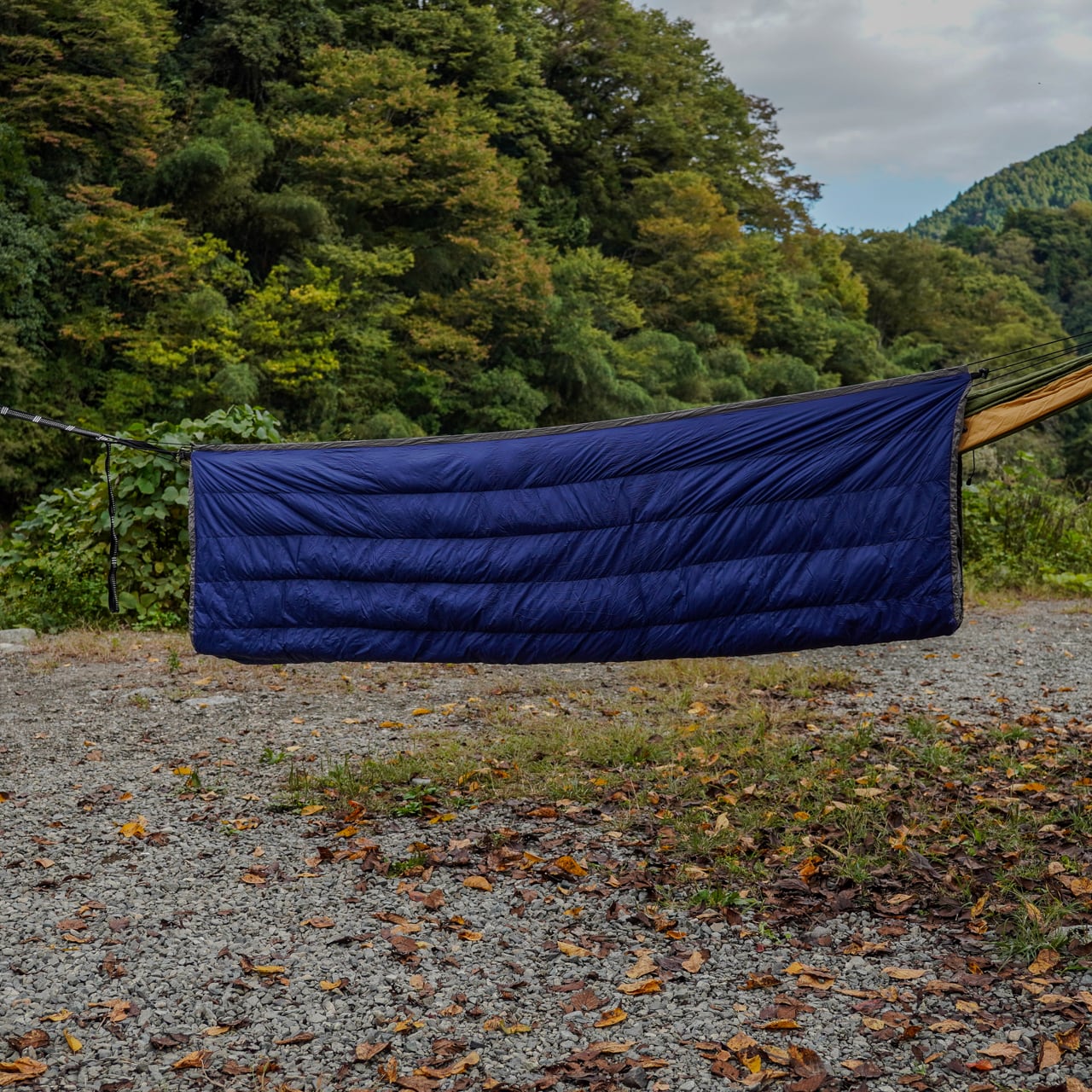 軽くて暖かなハンモックアンダーキルトダウン。寒冷地や高地でのハンモック泊に最適です。冷たい地面からの保温効果を提供し、快適なハンモックライフをお楽しみいただけます。ひろげれば柔らかく暖かい毛布として車中泊などでもご利用いただけます。持ち運びもダウン素材なためコンパクトサイズで、アウトドアイベントやキャンプに最適です。暖かさに包まれ寝心地も抜群です。冬のアウトドアライフに、ぜひこのハンモックアンダーキルトダウンを取り入れてみてください。
