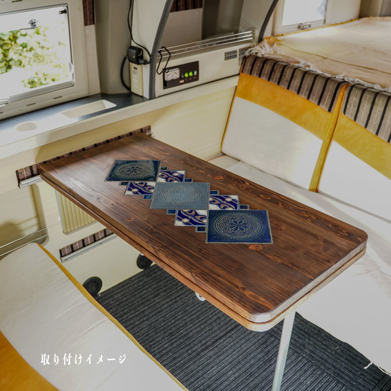 このタイルテーブルは、杉の天板にタイルを埋め込んだ、オリジナルのDIY用天板です。ご自身のキャンピングカーのテーブルのアタッチメントを付け替えることで、あなたのバンライフに合わせたカスタマイズが可能です。また、単独のテーブルとしても十分な存在感を持ち、自分だけの使いやすいアタッチメントを取り付けてお使いいただけます。これにより、さまざまなシーンで活用できる一品となっています。