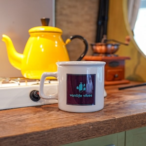 口元がふっくらしているので飲みやすく、スクエア型の取っ手がスタイリッシュさをプラスしてくれます。白いマグにスタンプされたロゴも可愛いポイント。オフィスや自宅、アウトドアでのティータイムやおしゃべりタイムに最適です。またスプーンなどの収納や観葉植物を入れてインテリアとして使うのもおススメです。