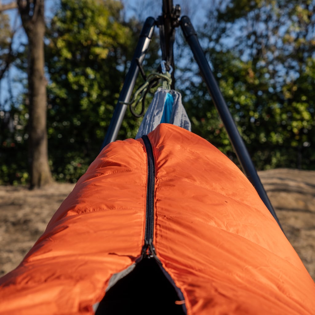 軽くて暖かなハンモックダウンシュラフ。寒冷地や高地でのキャンプに最適です。冷たい地面からの保温効果を提供し、快適なハンモックライフをお楽しみいただけます。ひろげれば柔らかく暖かい毛布として車中泊などでもご利用いただけます。持ち運びもダウン素材なためコンパクトサイズで、アウトドアイベントやキャンプに最適です。暖かさに包まれ寝心地も抜群です。冬のアウトドアライフに、ぜひこのハンモックダウンシュラフを取り入れてみてください。