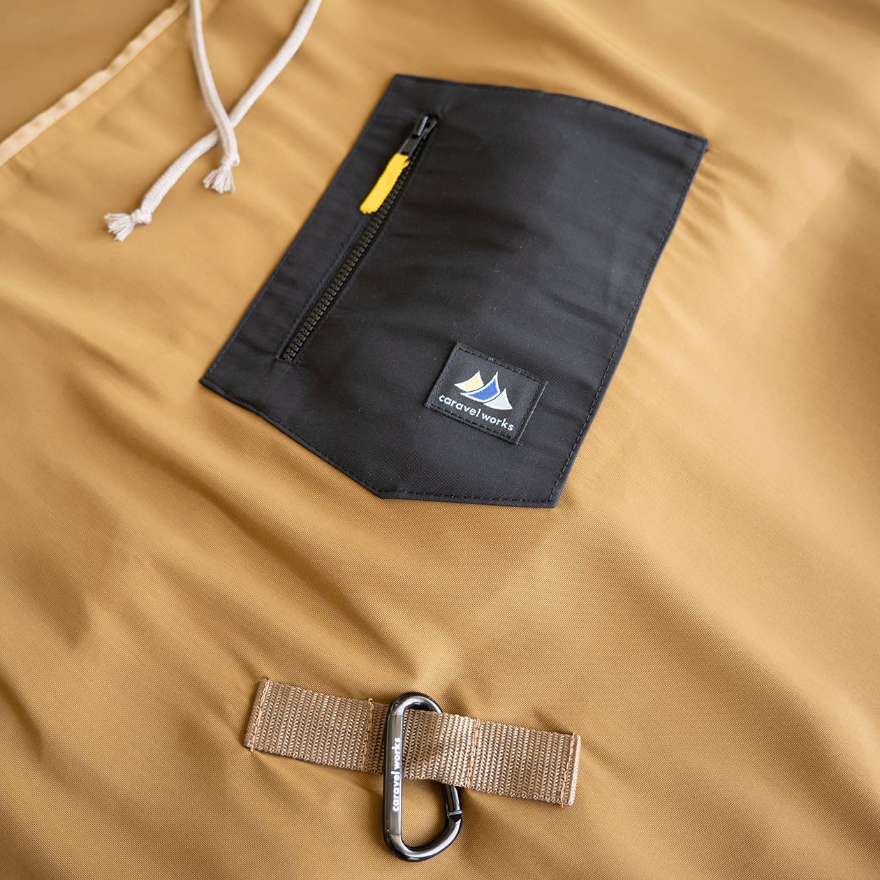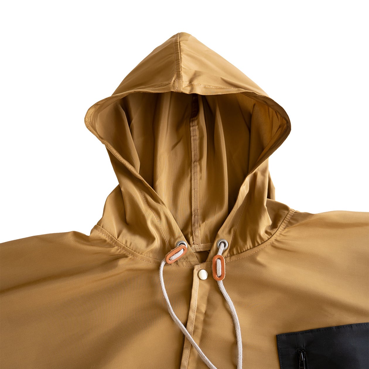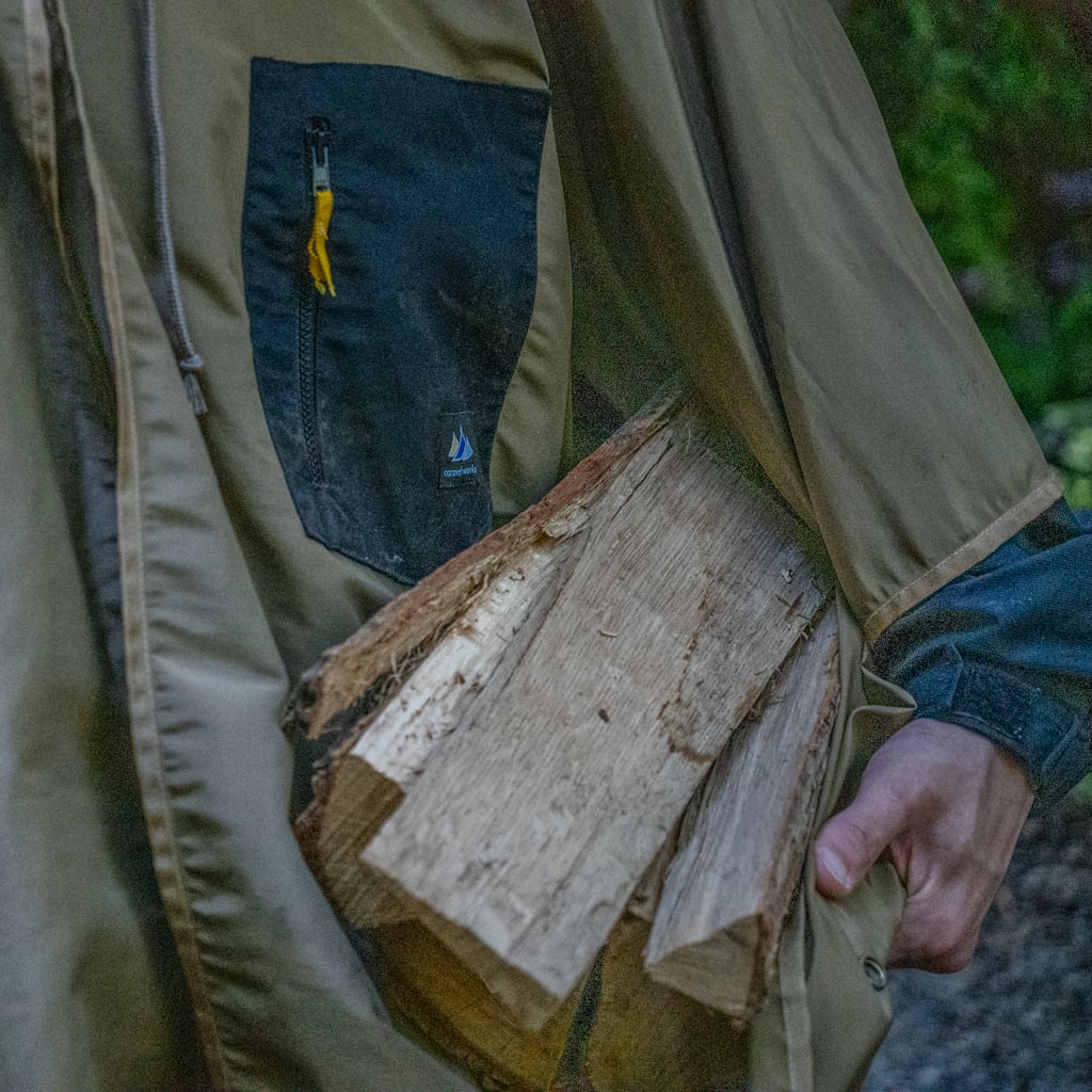 焚き火ポンチョは、アウトドアでの焚き火をより快適に楽しむために生まれました。撥水性と難燃性に優れたアクリル系合成繊維の生地で作られたこのポンチョは、火の粉や急な雨、湿気から身を守り、素材自体が難燃性を保有している為、繰り返し洗濯しても高い難燃性能を維持します。また軽量でありながらも耐久性に優れ、羽織るスタイルなので厚手のトップスの上からでも、薄手のトップスの上からでもストレスない着心地でオールシーズンを通して重宝します。