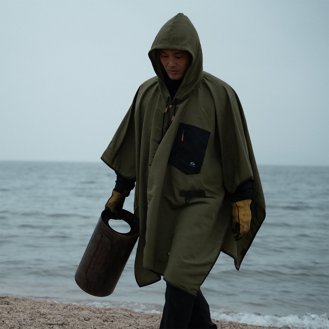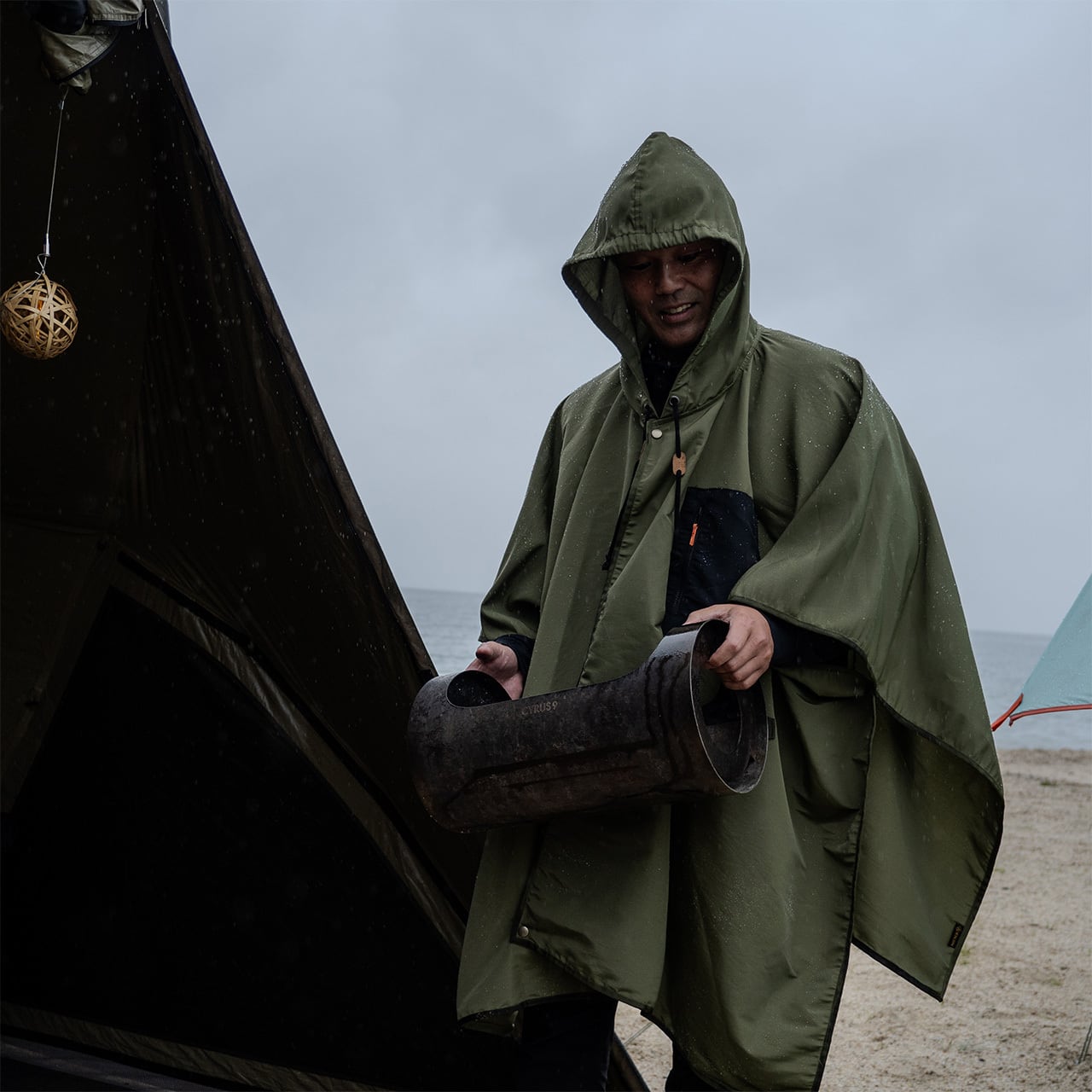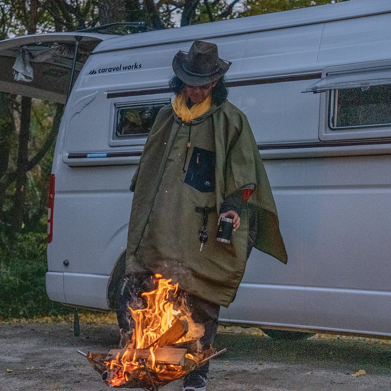 焚き火ポンチョは、アウトドアでの焚き火をより快適に楽しむために生まれました。撥水性と難燃性に優れたアクリル系合成繊維の生地で作られたこのポンチョは、火の粉や急な雨、湿気から身を守り、素材自体が難燃性を保有している為、繰り返し洗濯しても高い難燃性能を維持します。また軽量でありながらも耐久性に優れ、羽織るスタイルなので厚手のトップスの上からでも、薄手のトップスの上からでもストレスない着心地でオールシーズンを通して重宝します。